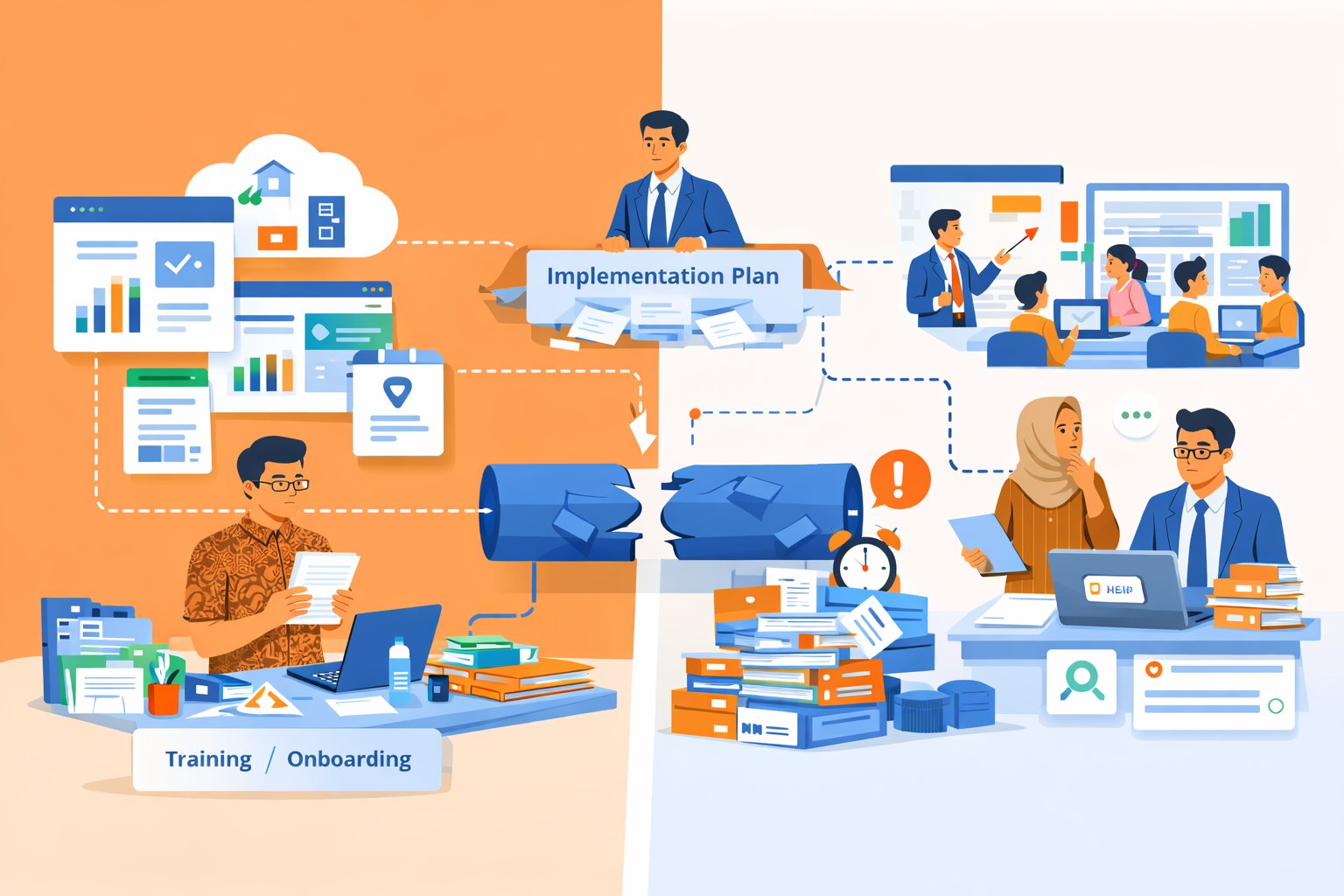 Namun dalam praktik sekolah, pelatihan sering datang terlalu singkat, terlalu umum, atau terlalu jauh dari masalah harian pengguna. Guru diberi sosialisasi fitur, tetapi tidak selalu dibimbing melewati hambatan yang paling nyata: bagaimana memakai sistem di sela jam mengajar, bagaimana mengatasi error yang paling umum, bagaimana menghubungkan platform dengan perencanaan kelas, atau bagaimana menghindari input ganda. Pelatihan yang hanya menjelaskan “apa yang ada di sistem” tanpa menjawab “bagaimana ini menyatu dengan pekerjaan saya” biasanya tidak menghasilkan adopsi yang kuat. Guru mungkin bisa mengikuti sesi pelatihan, tetapi tetap kebingungan saat kembali ke meja kerja.